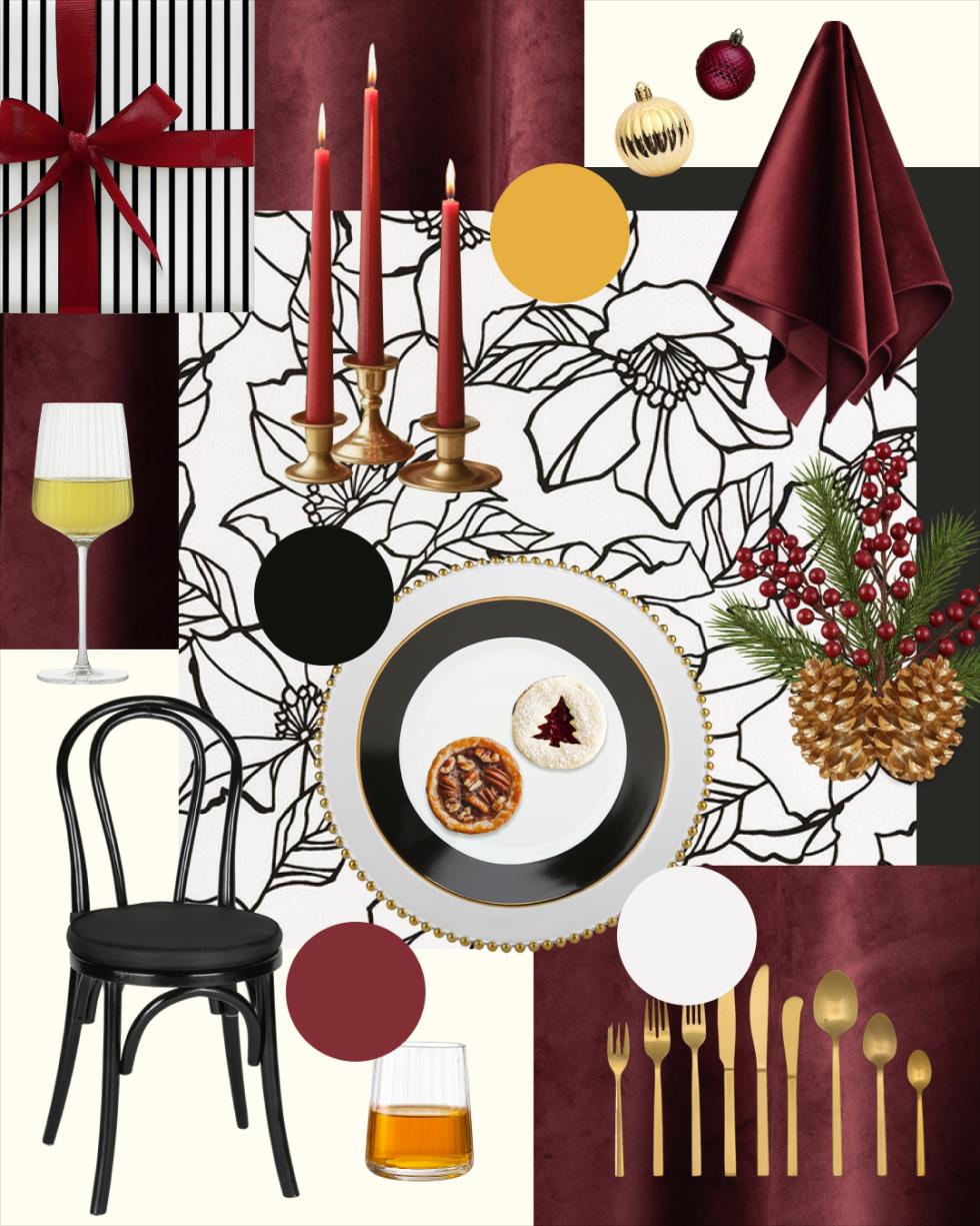 Host a celebration with striking sophistication using our Crimson & Gold Soiree tablescape. Rich burgundy velvet creates a dramatic, luxurious backdrop, paired with a graphic black-and-white floral linen that adds modern artistic flair. Sleek black-and-white dinnerware with gold beading introduces elegant contrast, while brushed gold flatware brings a warm, radiant glow to each setting.