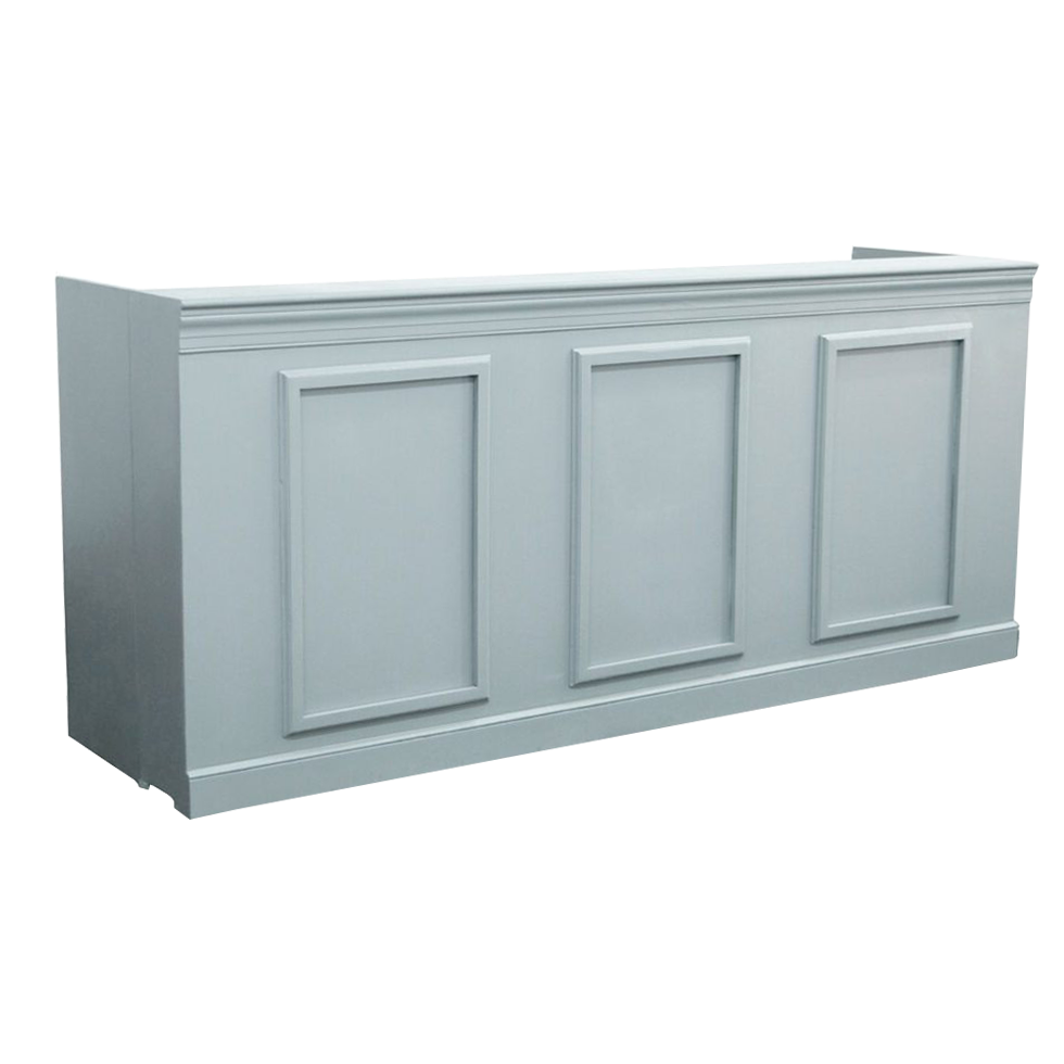 Our 8' Augusto Frost Panel Bar is designed to shape the tone of any event. Finished in a greyish-blue hue, our Augusto bar features customizable insert panels that allow you to tailor the look to your aesthetic, from minimal and modern to fully branded. Beyond its style, the bar is built for function, with a spacious integrated workspace that keeps service seamless and efficient. A statement piece in front, a hardworking setup behind the scenes.