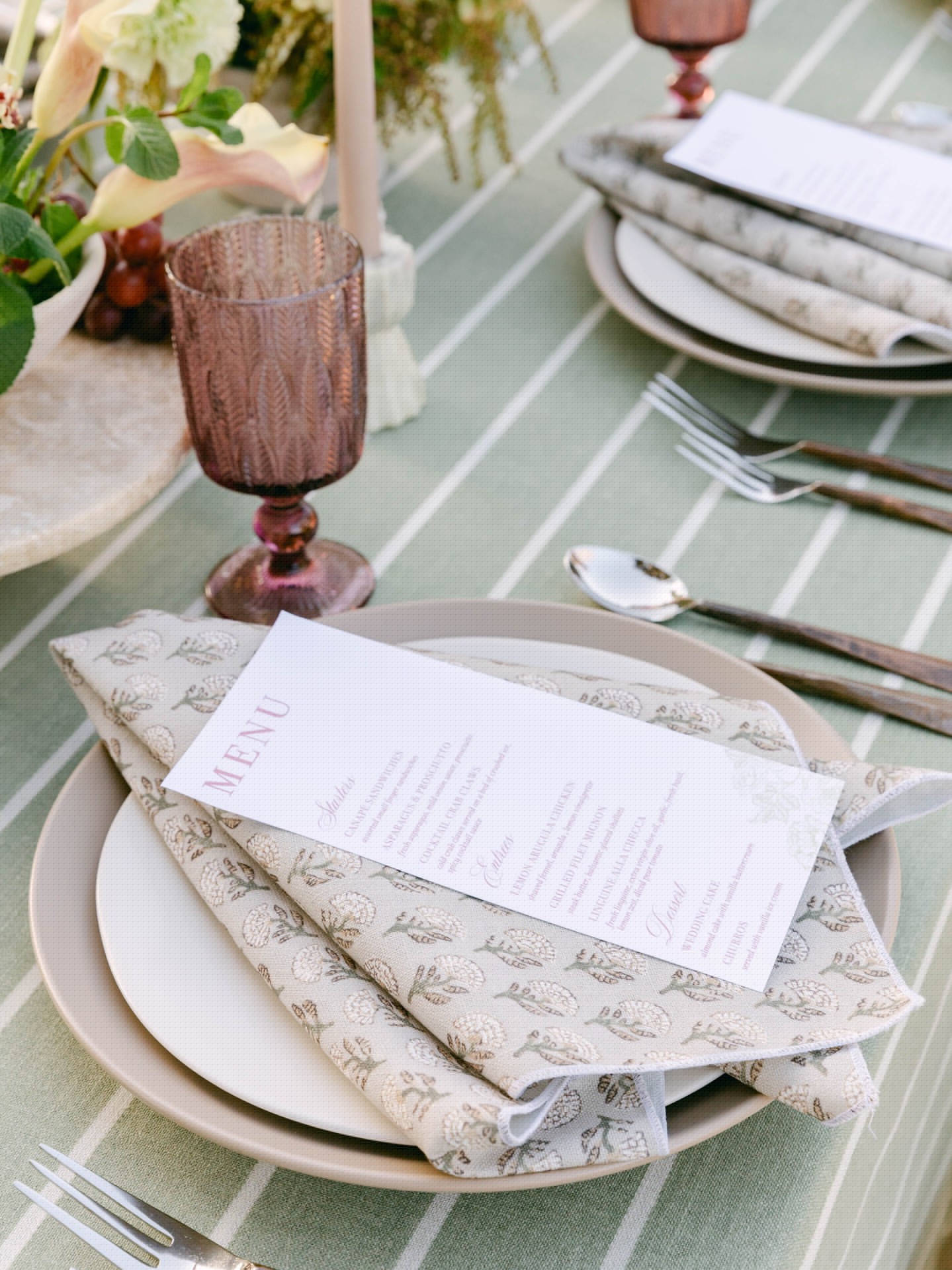 From the purple glassware to the layered linens and delicate florals, every detail tells the story of this garden table.