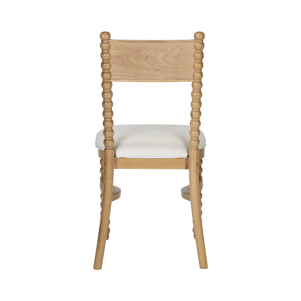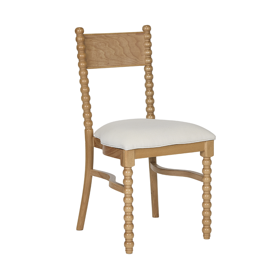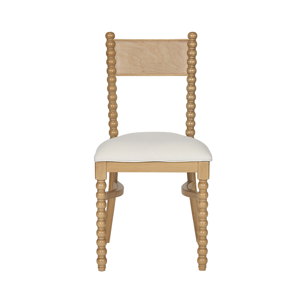 The Selma Spool Chair brings a fresh take on a classic silhouette with its natural wood finish and refined detailing. Featuring turned spool legs, a gently curved back, and a linen-upholstered seat, it offers a comfortable, versatile option for dining or accent seating.