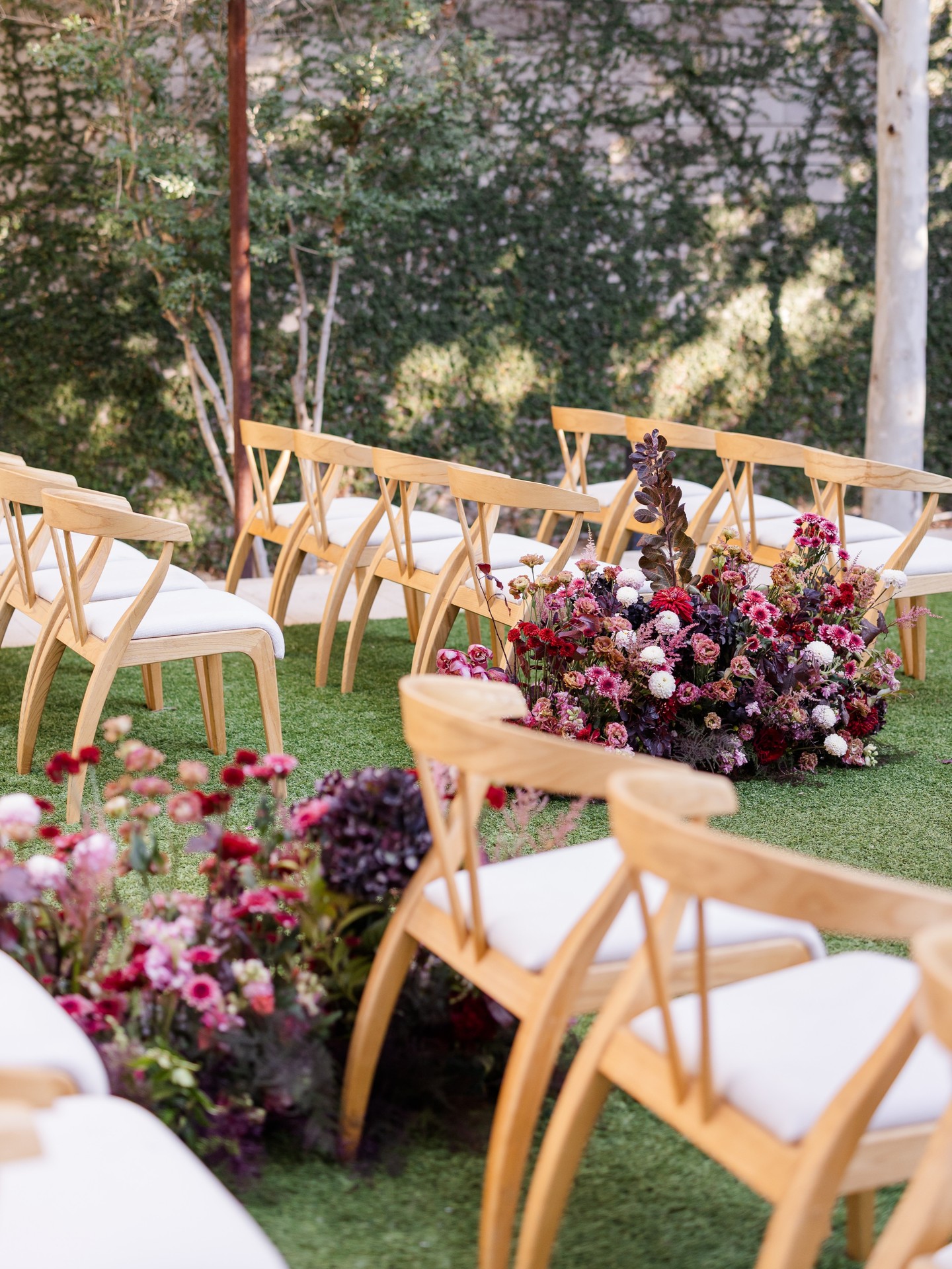 An intentional aisle: layered florals, warm wood, grounded textures.